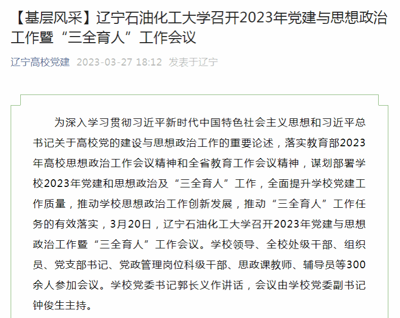 编者按:近日,辽宁高校党建微信公众号、辽宁日报·北国号对我校为落实教育部2023年高校思想政治工作会议精神和全省教育工作会议精神,谋划部署学校2023年党建和思想政治及“三全育人”工作,全面提升学校党建工作质量,推动学校思想政治工作创新发展,推动“三全育人”工作任务的有效落实,召开2023年党建与思想政治工作暨“三全育人”工作会议进行了宣传报道。现将相关报道转载如下: