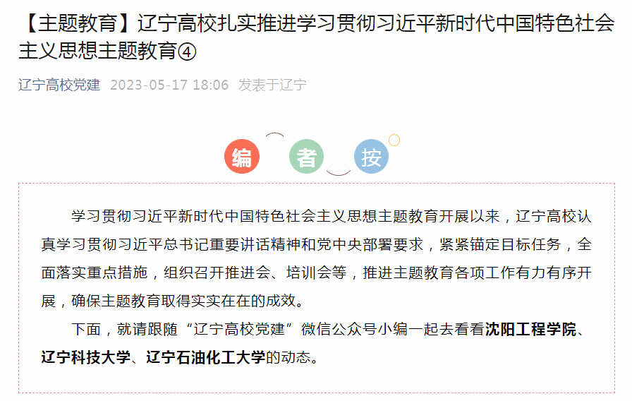 编者按:近日,辽宁高校党建微信公众号对辽宁高校认真学习贯彻习近平总书记重要讲话精神和党中央部署要求,紧紧锚定目标任务,全面落实重点措施,组织召开推进会、培训会等,推进主题教育各项工作有力有序开展,确保主题教育取得实实在在的成效进行了宣传,其中对我校召开学习贯彻习近平新时代中国特色社会主义思想主题教育领导小组工作会议进行了组稿报道。现将相关报道转载如下: