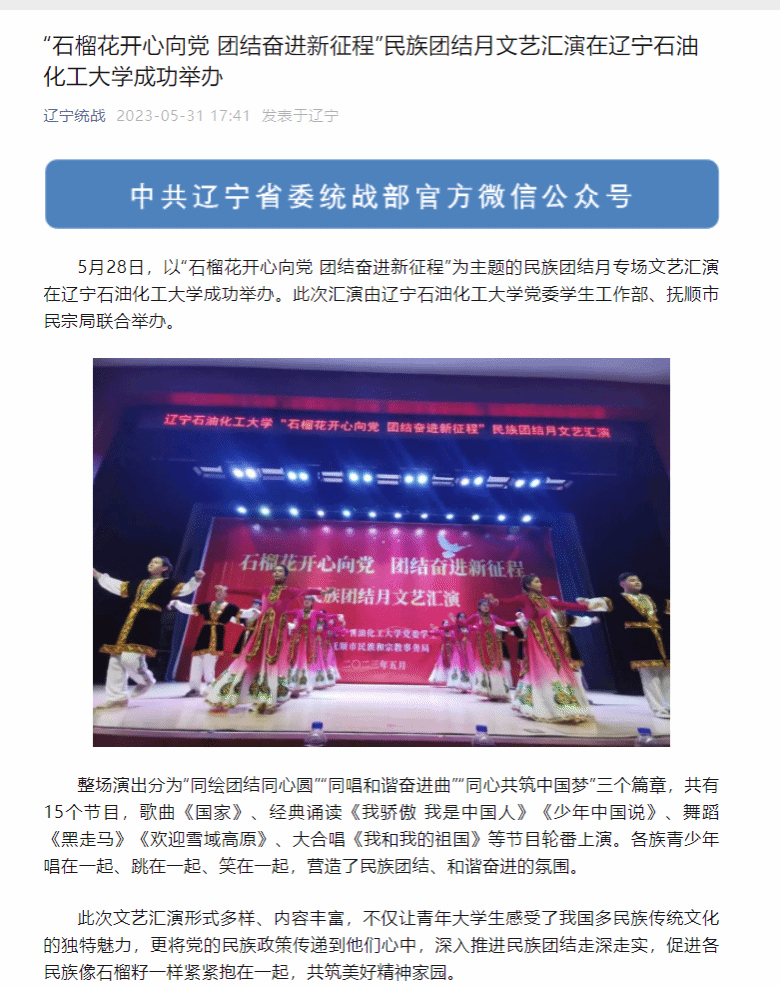 编者按:近日,辽宁统战微信公众号、抚顺日报对我校学生处少民办举办的“石榴花开心向党 团结奋进新征程”民族团结活动月文艺汇演包含的同绘团结同心圆、同唱和谐奋进曲、同心共筑中国梦三个篇章15个节目所展现的对传统文化的传承和共筑美好精神家园的积极作用进行了宣传报道。现将相关报道转载如下: