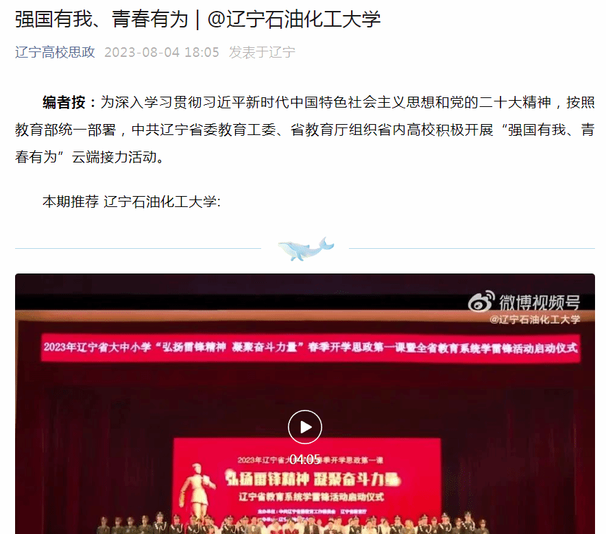 编者按:按照教育部统一部署,中共辽宁省委教育工委、省教育厅组织省内高校积极开展“强国有我、青春有为”云端接力活动。8月4日,辽宁高校思政微信公众号对我校全体师生将始终牢记习近平总书记的殷切嘱托,肩负强国担当,在学思践悟中坚定理想信念,在奋发有为中践行初心使命,让雷锋精神在辽石化大绽放更加璀璨的光芒,努力为实现第二个百年奋斗目标、实现中华民族伟大复兴的中国梦和辽宁全面振兴新突破贡献智慧和力量进行了宣传报道。现将相关报道转载如下: