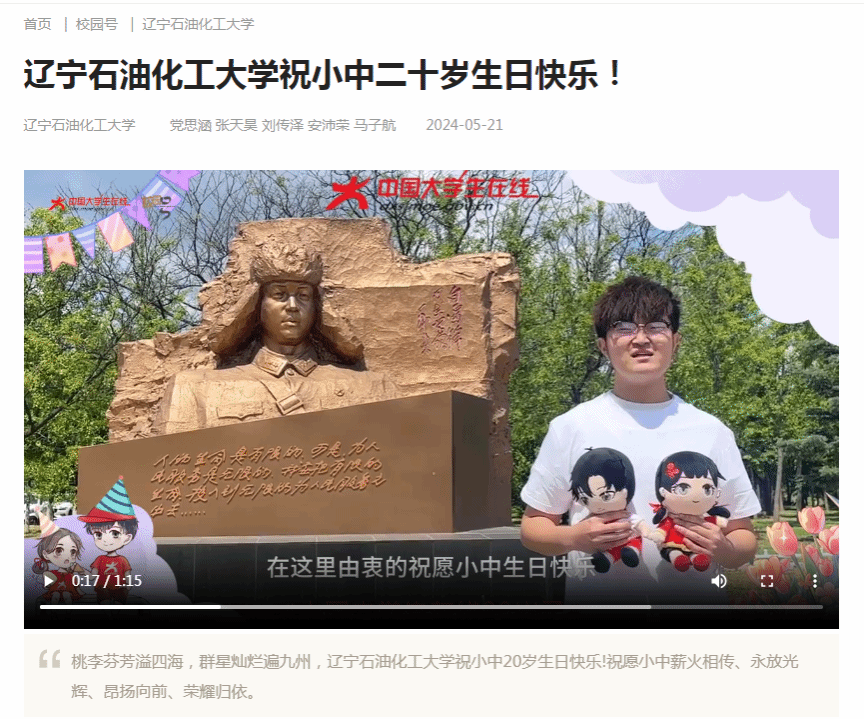 编者按:近日,中国大学生在线20周年开展互动征集,我校校网通站学生制作祝福视频祝小中二十岁生日快乐,中国大学生在线网对此进行了宣传。现将相关报道转载如下: