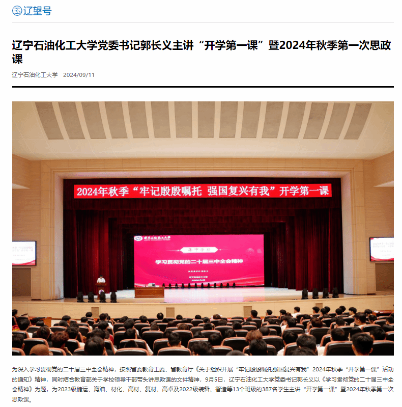 编者按:为深入学习贯彻党的二十届三中全会精神,按照省委教育工委、省教育厅《关于组织开展“牢记殷殷嘱托强国复兴有我”2024年秋季“开学第一课”活动的通知》精神,同时结合教育部关于学校领导干部带头讲思政课的文件精神,9月5日,国产亚洲综合一区二区三区_亚洲欧美日韩中文天堂_尤物在线观看视频不卡无码_国产最新精品亚洲2025不卡_亚洲成Av人在线观看片水蜜桃党委书记郭长义以《学习贯彻党的二十届三中全会精神》为题,为2023级储运、海油、材化、高材、复材、高卓及2022级装备、智造等13个班级的387名学生主讲“开学第一课”暨2024年秋季第一次思政课。中国大学生网、人民日报客户端•人民号、辽宁日报•辽望号对此进行了宣传报道。现将相关报道转载如下: