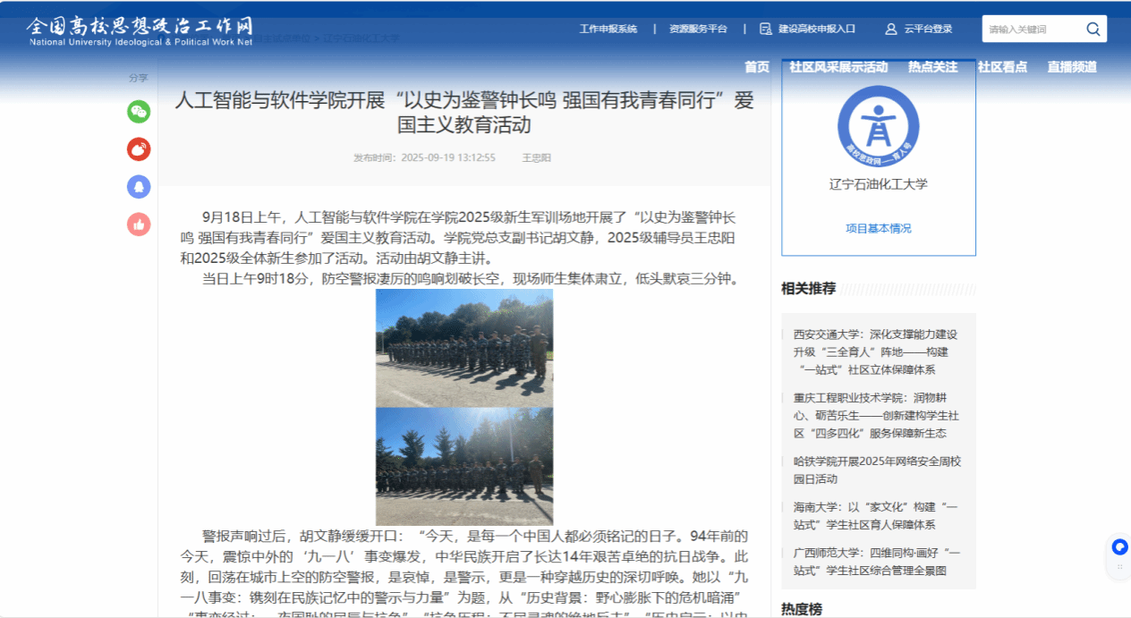 编者按:近日,人工智能与软件学院开展了爱国主义教育活动。此次活动为新生上了 “思想教育第一课”,播下了爱国的种子,是一次凝聚青春力量的精神洗礼,为新生筑牢思想根基打下了基础。全国高校思想政治工作网一站式学生社区对此进行了宣传报道,现将相关报道转载如下: